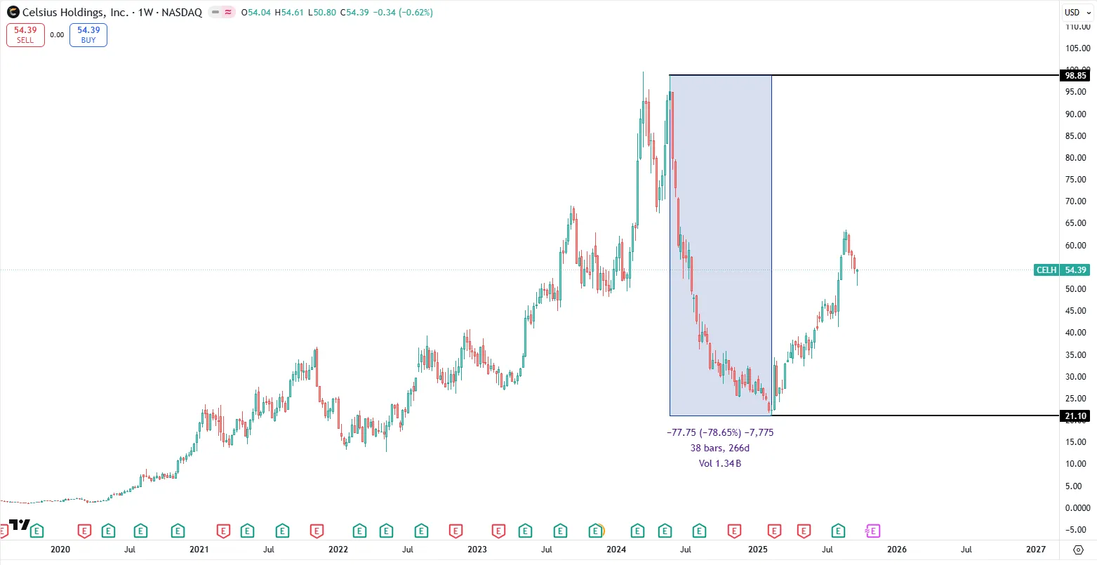 Celsius曾经用了672天,股价暴涨了680.11%,相当于差不多翻了8倍。