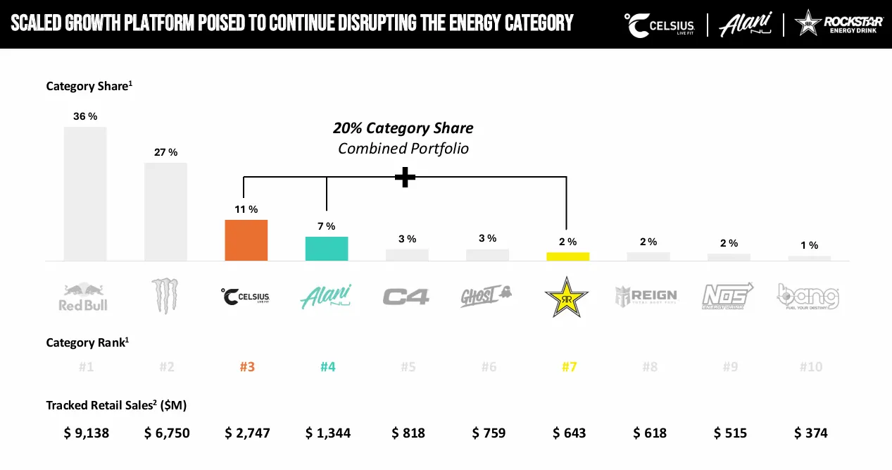 Celsius财报中这张图可以说是很形象地展现了目前全球功能饮料的格局。我们看到,红牛目前仍然是老大,独占全世界功能饮料市场36%的市场份额。第二是Monster,占据全球27%的市场份额。第三就是Celsius,目前占据全球11%的市场份额。而我们还能看到,第三名Alani和第七名Rock Star,其实也是Celsius旗下的子品牌。也就是说,管理层把这3个牌子加到一块,组合整体,占据着全球20%的市场份额。