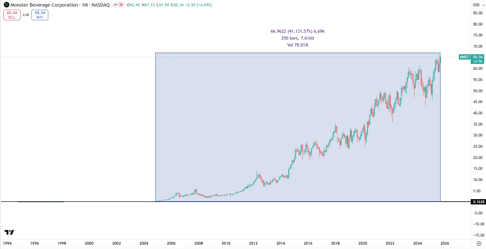 效果就是,Monster给股东20年内,带来了41131.57%的回报。