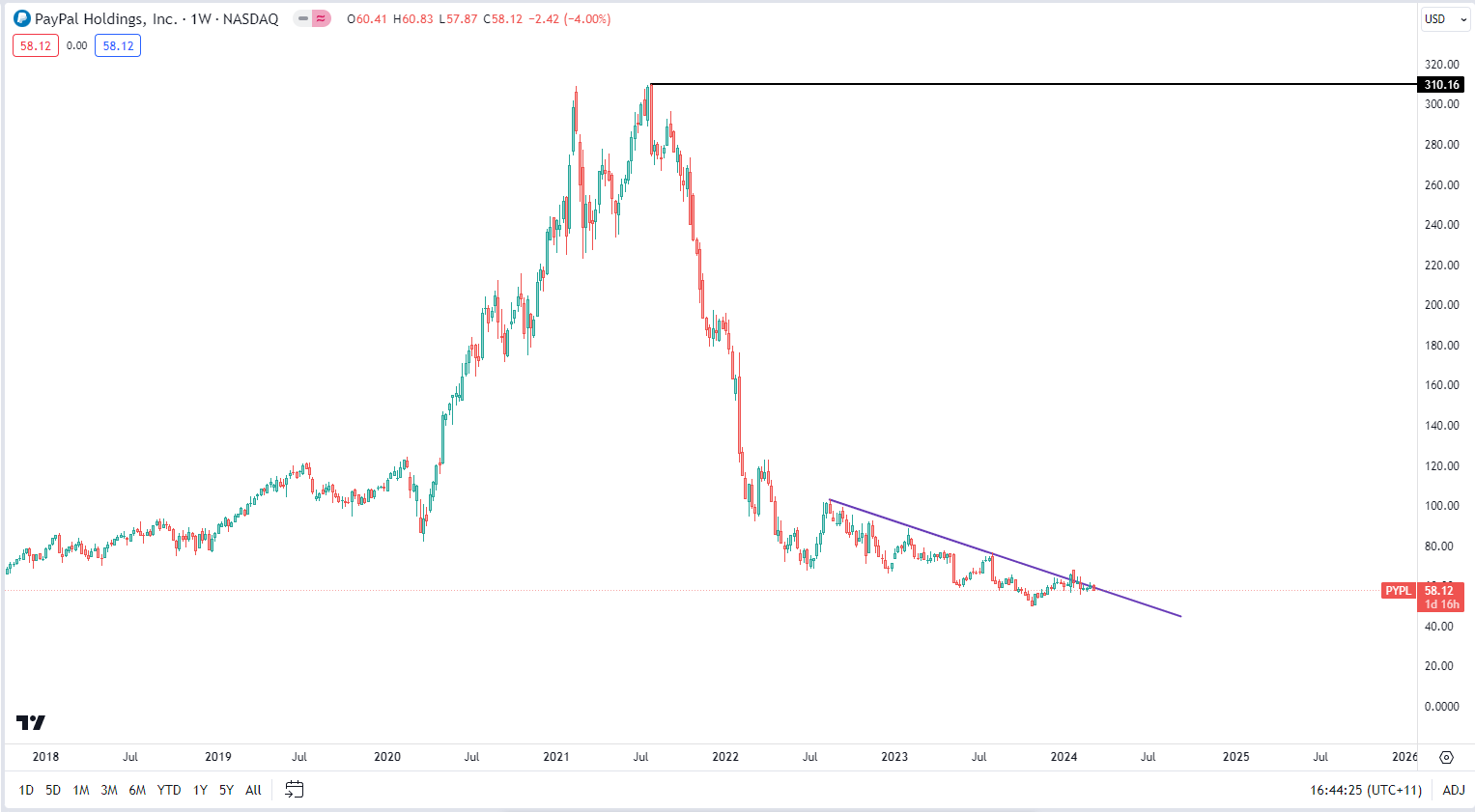 而我开始关注Paypal,大概是2022年底,那个时候Paypal的股价大概在60多,22年那波股灾中,Paypal跌幅达到了恐怖的78%