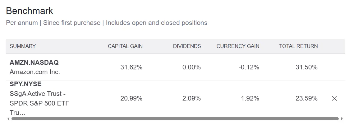 这是我个人投资账户中亚马逊仓位的表现。我们看到,目前我的亚马逊仓位复合年化增长率CAGR,不考虑汇率因素的话,为31.62%,而同一时间段,假如我投资的是标普500大盘指数基金ETF的话,不考虑汇率因素,我的CAGR将会是21.67%。其实这个时间段,即便是投资大盘,回报也是非常亮眼的。不过,我的亚马逊仓位跑赢大盘挺多的。