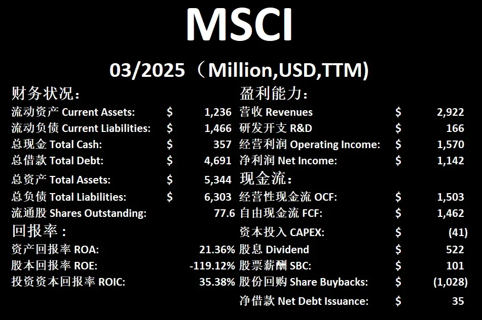 最新财报之后,在我的打分体系中,MSCI可以打到80.50分。分数很高,妥妥的是一家80分以上的复利机器。公司扣分项主要是2个方面。第一,公司杠杆率打得有点高了。手里流动现金便宜现金+3年FCF才能还清借款。第二,公司营收增长虽然特别稳定,但是增长率谈不上顶级。并不是一家飞速增长的公司。