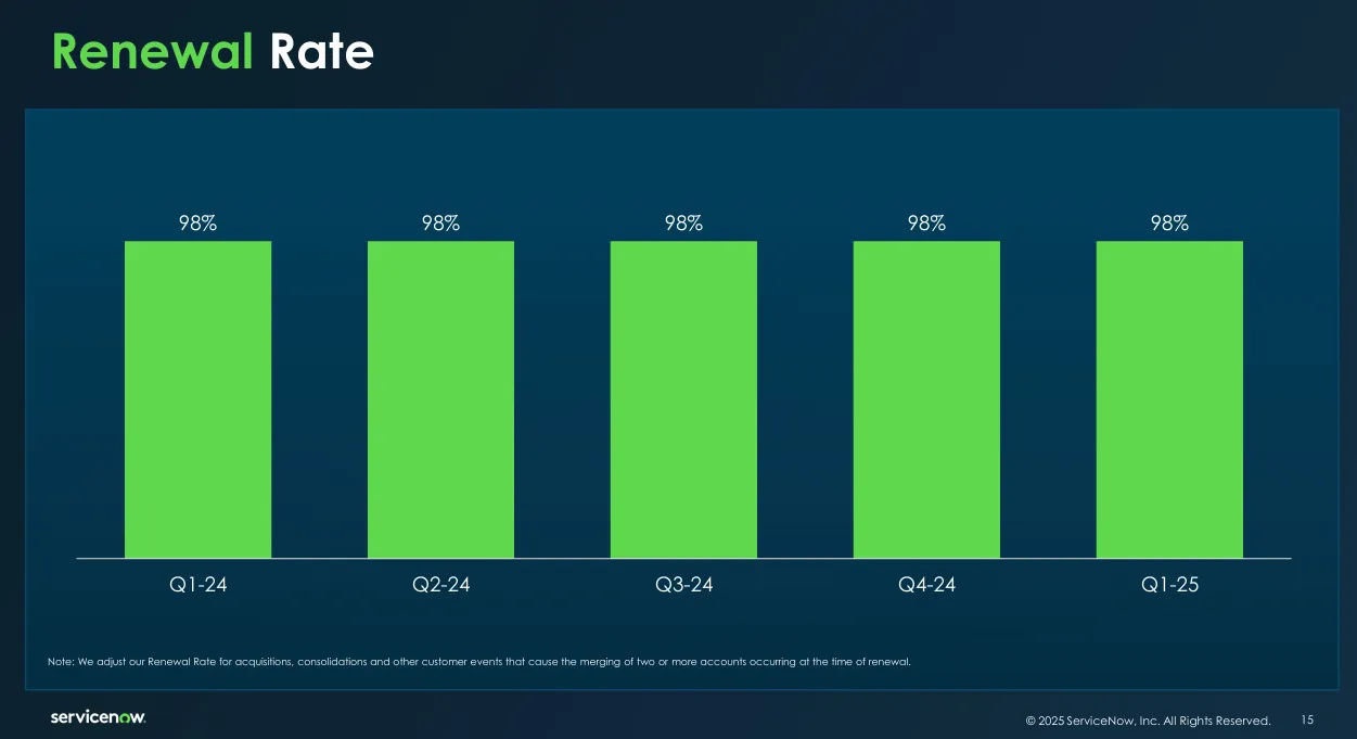 比如这张图,所谓Renewal Rate其实就是Churn Rate,客户流失率的反义词。从图上可以看出,基本上Service Now它的Churn Rate常年保持在2%。这里算是很健康的数据了,也是公司产品黏性大的直接证据。