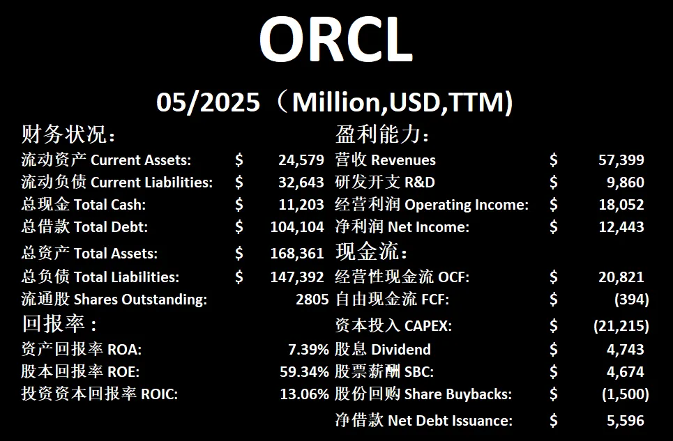 最新财报之后,Oracle在我的打分体系中,可以打到63.40分。这个分数不算高。Oracle的财务状况令人堪忧。资产负债表很弱。104B的借款,手里只有11B的现金,目前自由现金流是负的。经营现金流其实也就20.8B,即便它不进行CAPEX,它也得5年的FCF才能还清借款。更何况现在Oracle目前已经在AI军备竞赛中杀红眼了。其次,公司盈利能力也不算好。增长不快,不过,利润率还算挺高的,有30%多。总的来说,这个基本面实在是算不上优秀吧。