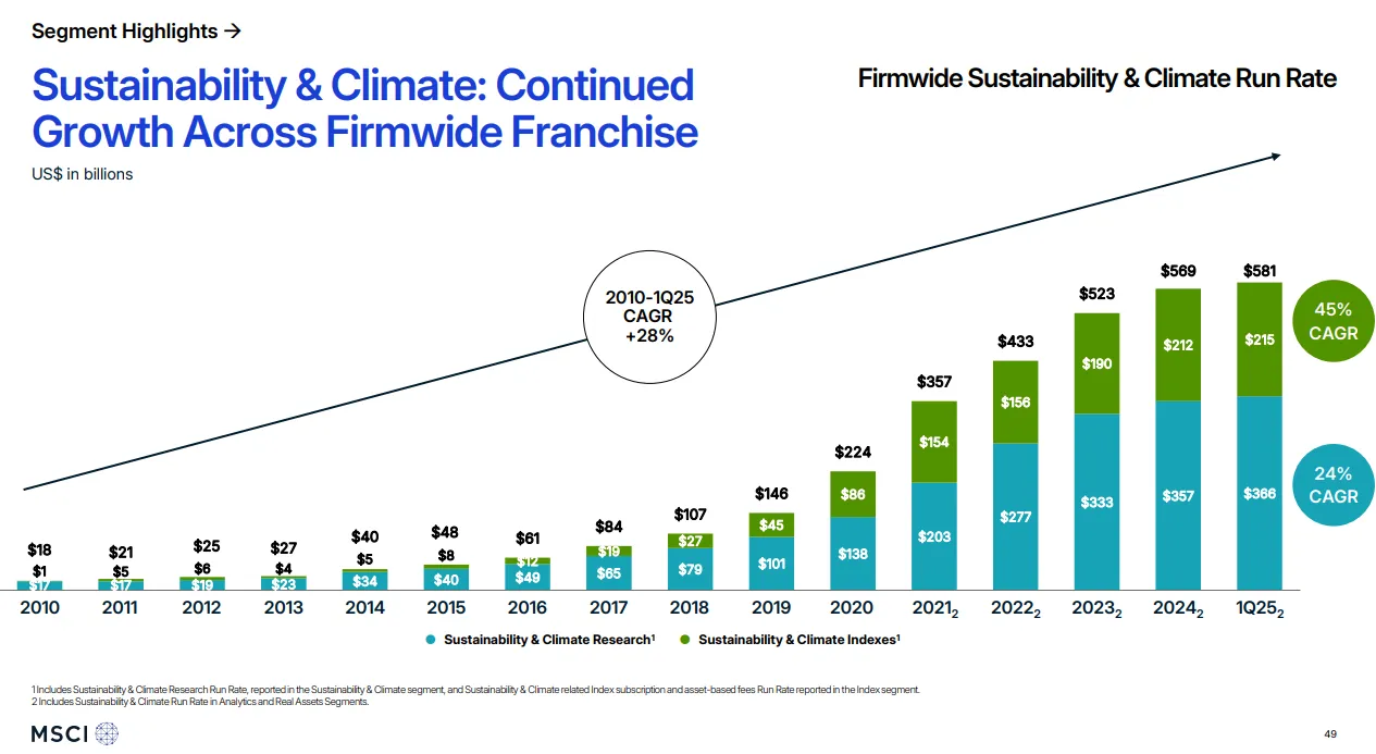 其实,老实说,我刚开始之所以关注MSCI主要还是因为它的指数业务。这个业务很好理解,现在ETF和被动资产管理越来越流行,MSCI的指数业务其实未来很好预测。但是,当我读完公司财报之后,我明显感觉到可持续性和气候业务才是公司管理层的卖点。