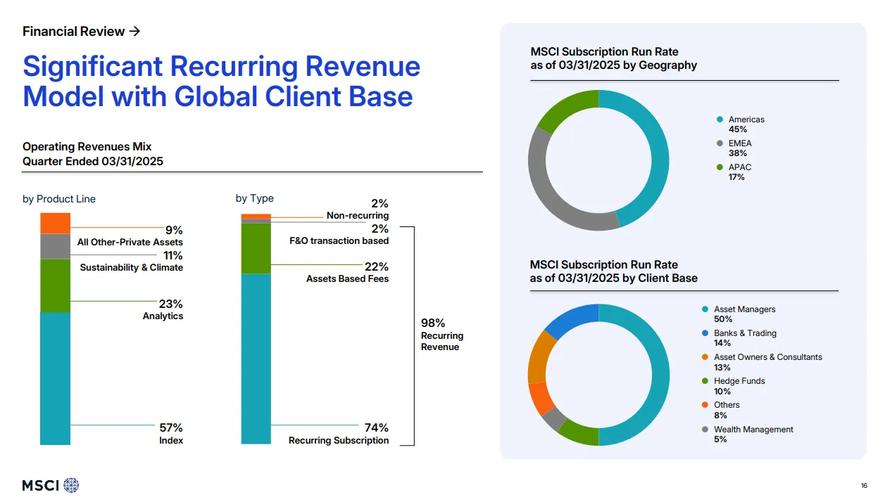 我投资MSCI主要还是冲着它的指数业务去的。我认为这是未来的一个趋势,ETF会越来越火,越来越多的投资人会成为持有ETF的被动投资人。其次,研究财报之后,我也是更加Bullish,因为它开发的的这个可持续性和气候评级业务,似乎正在高速被全球投资机构采用。如果增长率能保持的话,显然会成为未来一个很大的营收来源。而且,这家公司的业务超过7成,都来自订阅,这种Recurring营收也是目前主流的SAAS打法。暂时我的仓位不大,只占我投资组合的1%,不过我主观上还是想持有公司更多的股份。