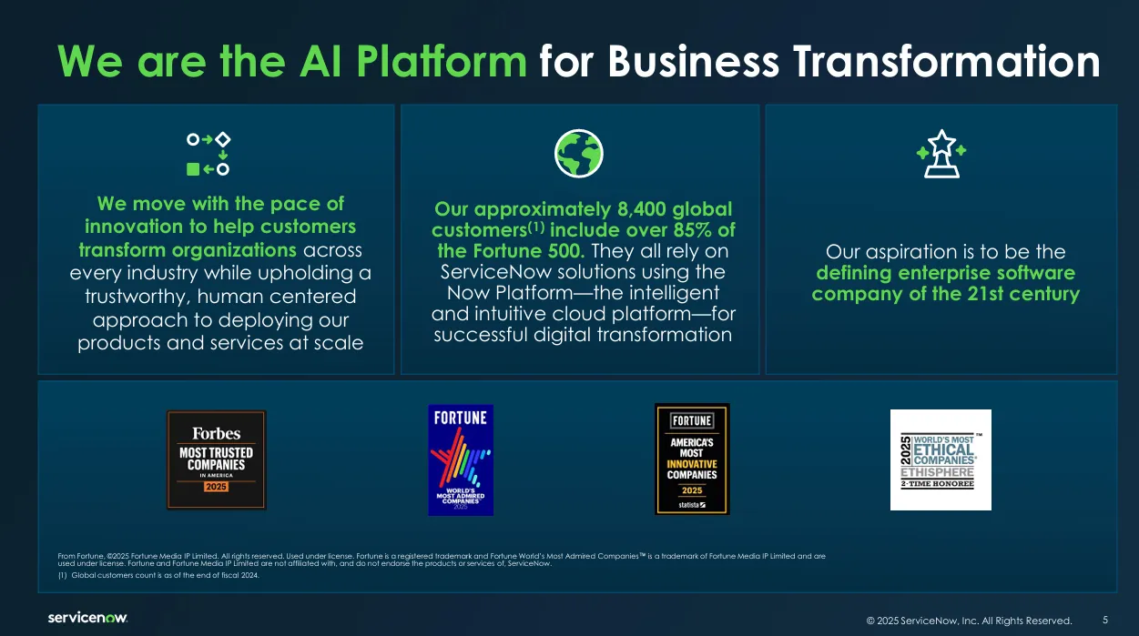 扯太远了,这次Service Now财报开篇,非常醒目的,生怕投资人没看到一句标语。We are the AI Platform,我们是一家AI平台。这年头,似乎每家公司都在财报里疯狂往AI上靠,生怕自己给落下了。