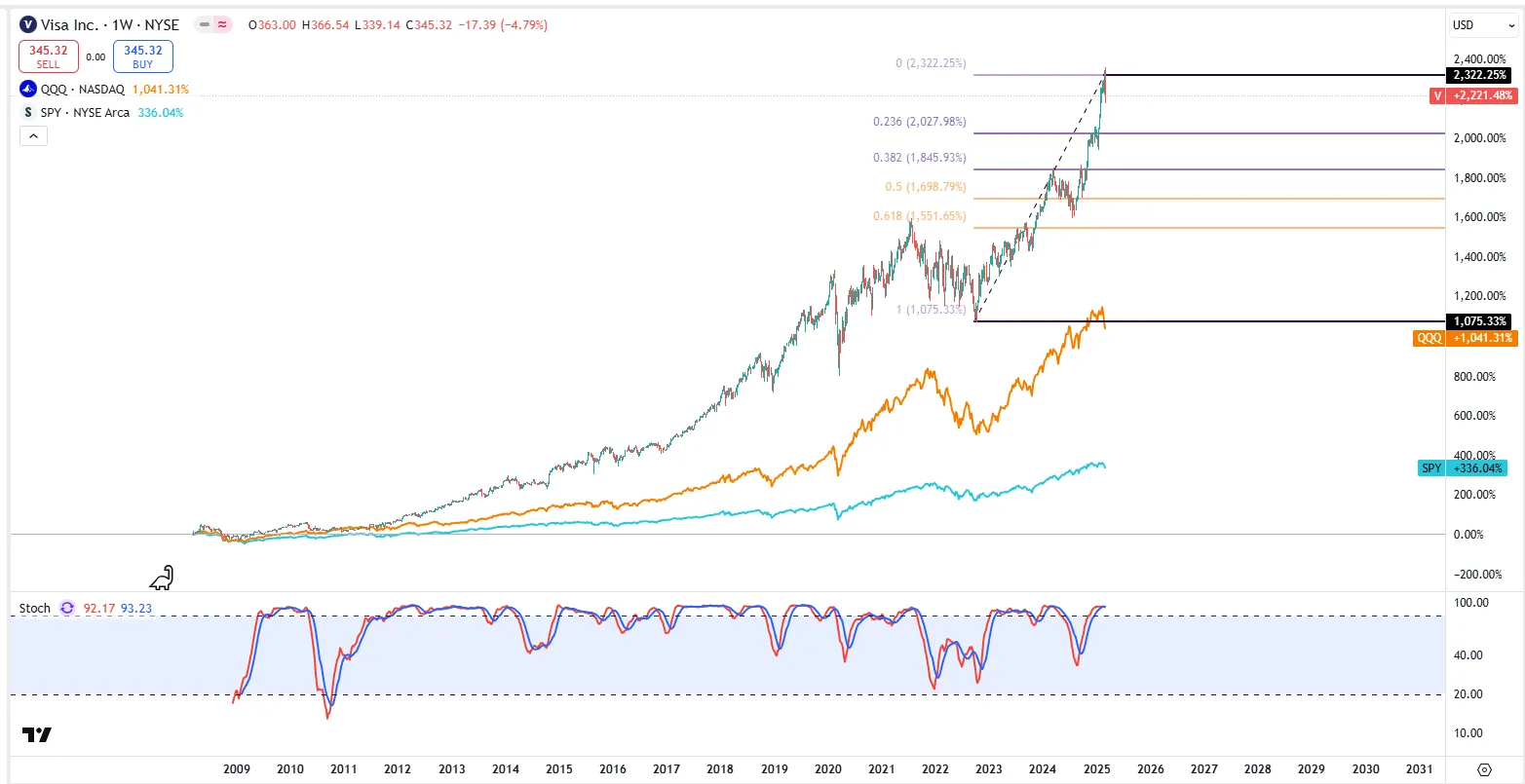你如果回顾历史,Visa自从上市以来,已经给投资人提供了2322.25%的回报。这还仅仅只是股价上的增值而已。而同一时间QQQ只有1041.31%,SPY只有336.04%。