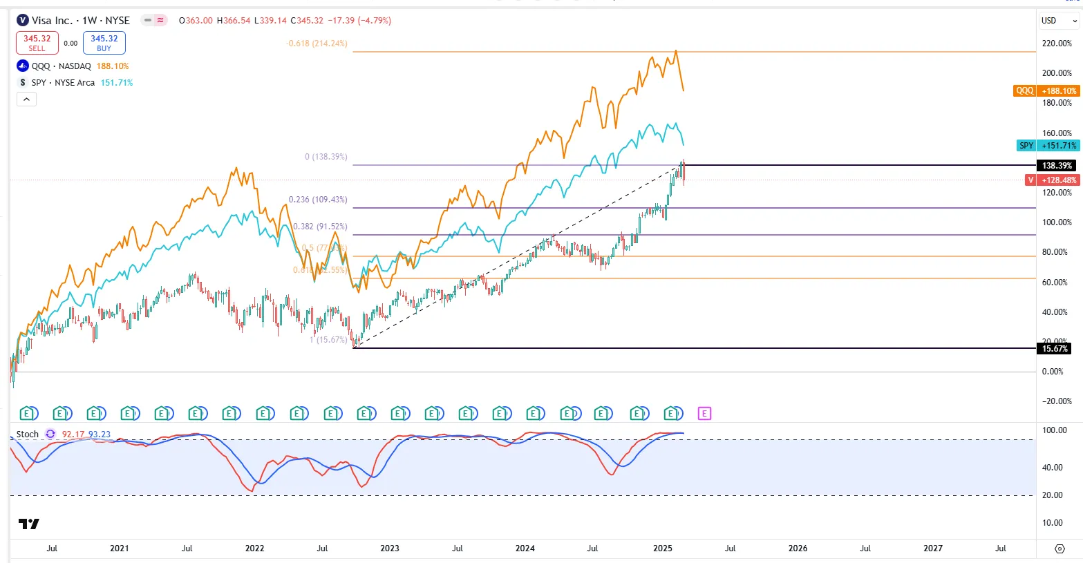 这是为什么呢?总的来说就一个原因,高利率。因为利率过高,导致Visa,Mastercard,Amax,甚至于很多Fintech公司,比如Paypal表现都差强人意。我记得最近看CNBC上有些人提到2025年将会是支付网络公司的天下。这个观点也是激起了我的兴趣。虽然我是没法预测未来的,但是,既然有人如此看好这些公司的未来,我也是听听其中的道理。其实他们的理由也是很容易理解。因为现在市场将会进入降息周期,而降息对于这些公司而言,毫无疑问将会是很大的利好。降息同时还会导致消费力的恢复和增长。越来越多人更愿意消费,自然也是Visa这种公司的大利好。