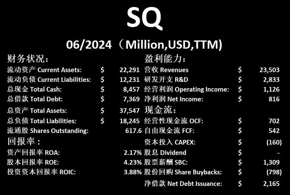 在我的打分体系中,Block可以打到67.75分。公司盈利指标得分相当高,属于年轻的,高增长公司。不过短板也是很明显,公司一直在增发,SBC派发非常高,ROIC很低。另外公司产生现金的能力似乎不稳定,具有周期性,这一点和Paypal相比,似乎差强人意。另外,虽然经营利润目前季度刷新了新高,但是利润率不高,只有4.79%。