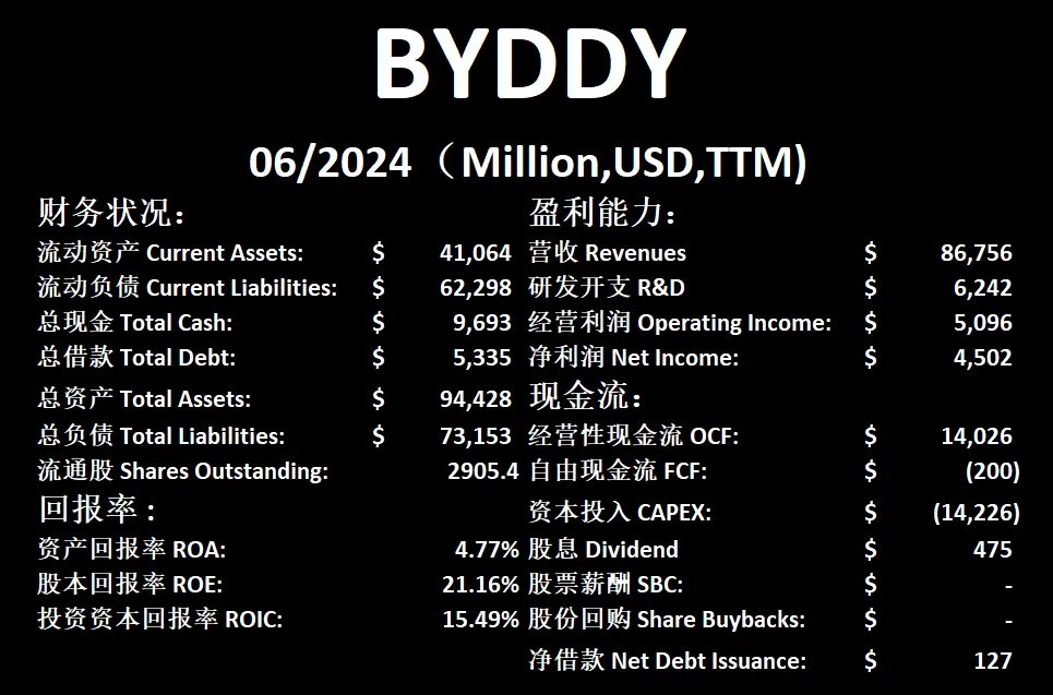 在我的打分系统中,比亚迪能打到64.5分。主要扣分项是公司增发股份和公司产生自由现金流的能力。对于巨型EV汽车制造商来说,其实比亚迪的财报已经不错了。最新季度之所以现金流缩水严重,是因为账面上出现了一笔 $10B 的其他开支。再加上CAPEX巨大,比亚迪目前最新自由现金流是负数。
