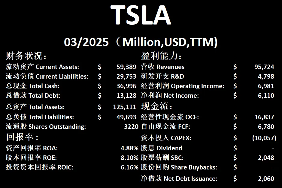 最新财报之后,在我的打分体系中,特斯拉可以打到70.25分。这个分数本身不算低了,而且在我的频道中,我也是一直强调,我认为特斯拉其实是一个很出色的汽车制造商。不过,目前特斯拉短板明显,特斯拉在5年来流通股没有降低,反而有所增加。CAPEX巨大。SBC派发非常巨大,这里和Elon自己要钱也是息息相关的。ROIC自从Tax Credits取消之后,也是一落千丈。经营利润率目前也是只有7%,这个数据基本上和其他汽车制造商已经看齐了。但是,特斯拉的盈利能力5年来还是表现很优秀的,因为5年前特斯拉才刚刚开始盈利。之前我有提到过,如果特斯拉没法迎来新的一轮盈利指数级飞跃,可能往后特斯拉的盈利能力项目上也要开始掉分了。