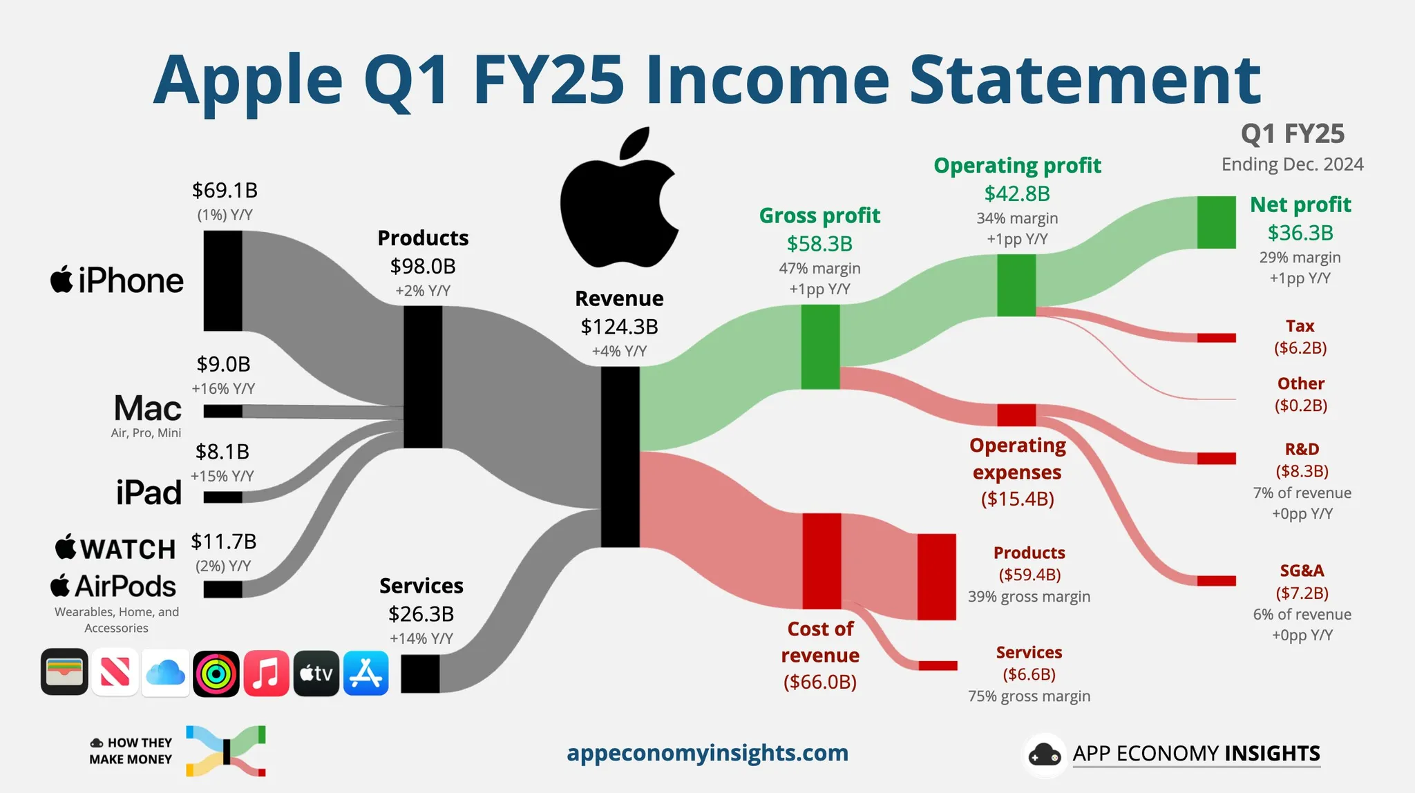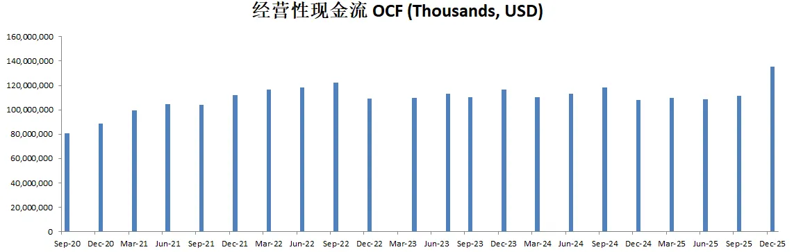 -财务亮点 苹果本季度实现营收 1243 亿美元,同比增长 4%,创历史新高。每股收益(EPS)达 2.40 美元,同比增长 10%,同样创下纪录。毛利率为 46.9%,环比提升 70 个基点。净利润达到 363 亿美元,运营现金流 299 亿美元,其中包括 119 亿美元用于与国家援助相关的付款。此外,公司在本季度向股东返还了 300 亿美元资本,包括 39 亿美元股息 和 233 亿美元股票回购。