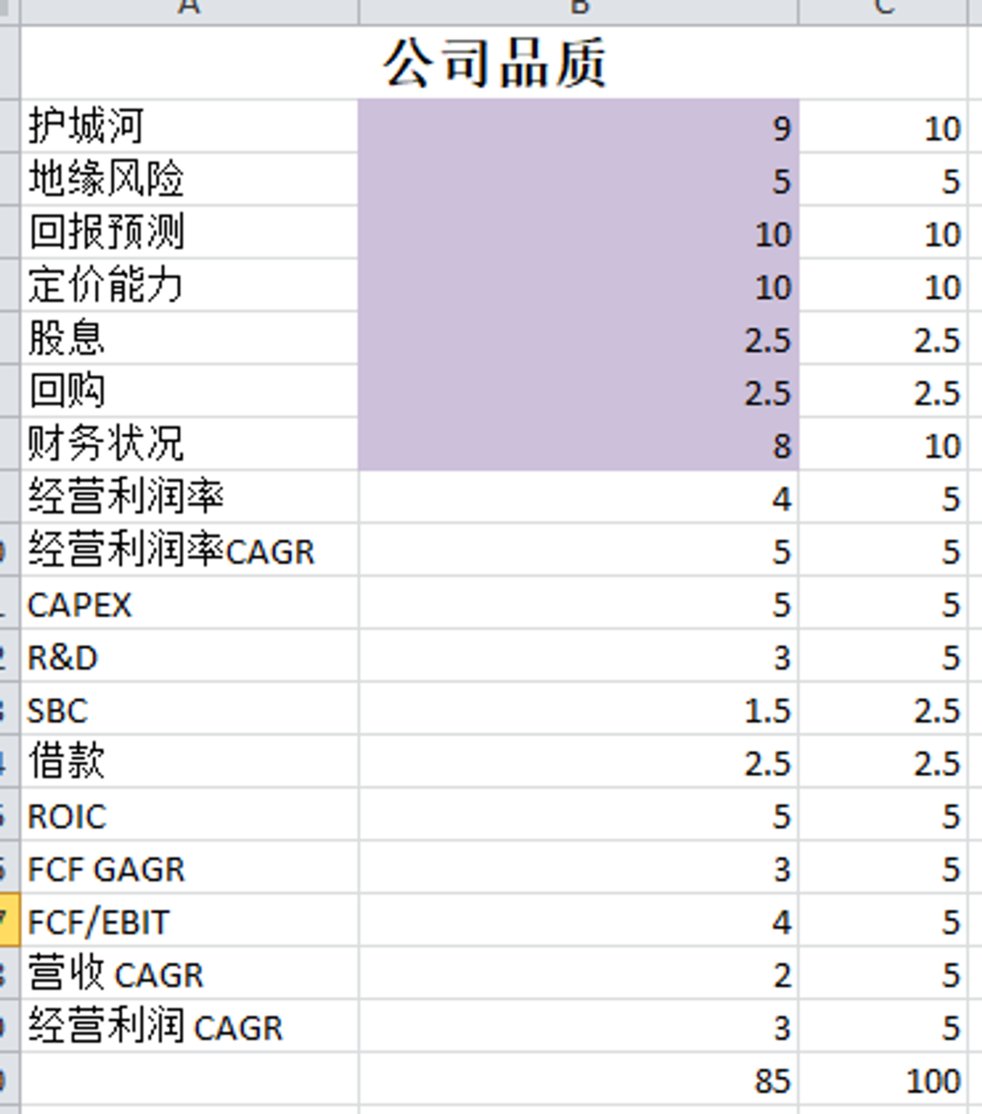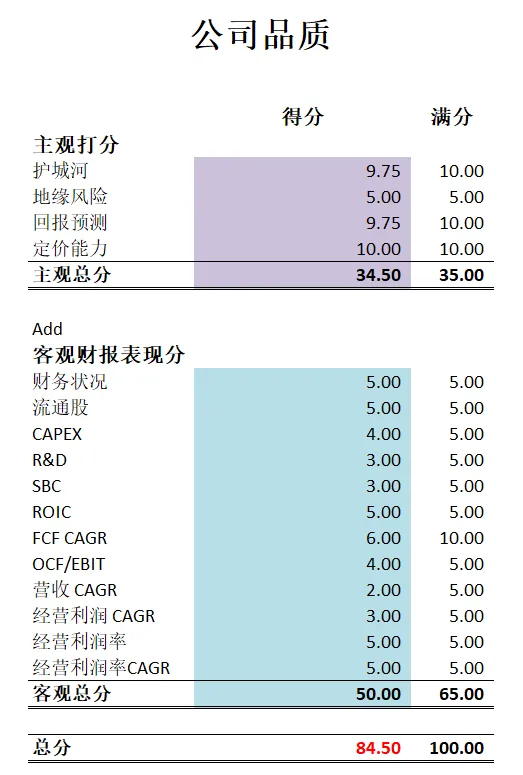 -苹果属于我能力圈中心的公司,我也持有较大苹果仓位。它的品质分有85分,公司表现基本上没什么可挑剔的地方。85分也是比80分一档的公司要高出一大截。