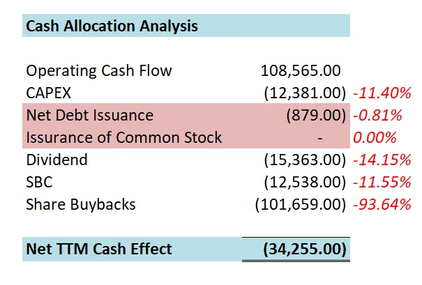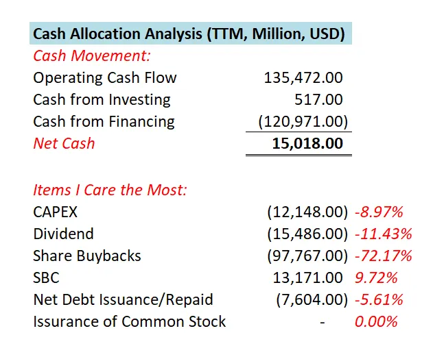 -苹果目前绝大部分的现金,都用于股份回购,占FCF的 92.34%