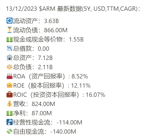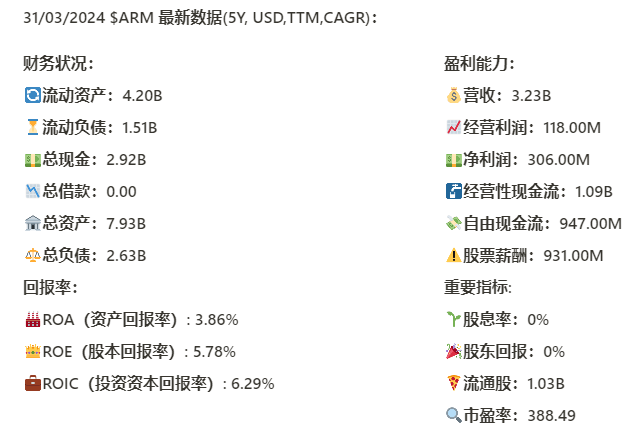 Arm Holdings 财务健康,回报率目前来看还行,盈利能力值得商榷,属于典型的刚IPO的公司,Hype>Profitability