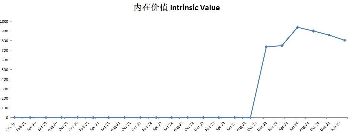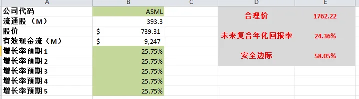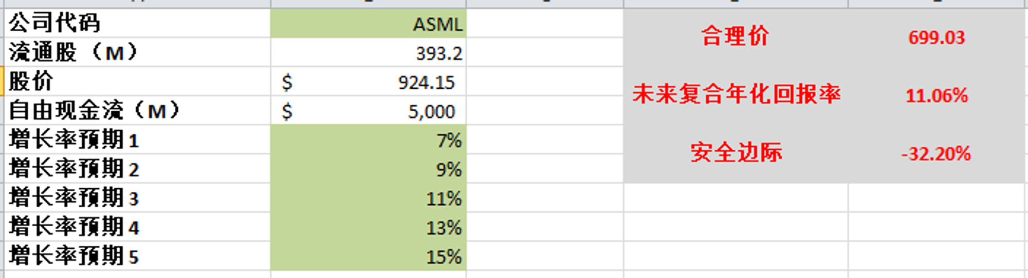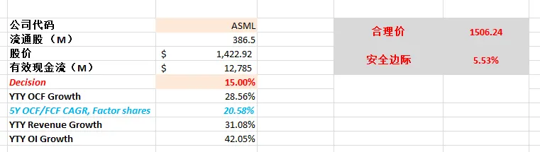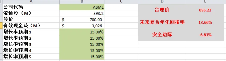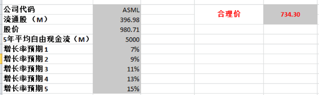 -以目前最新有效现金流9.85B,基于CAGR 15%(5年CAGR为27.28%)算下来,合理价目前为804.02。这里有2点,第一,我认为我给15%的CAGR其实是对ASML有一定低估的,毕竟它5年来的现金流增幅是非常夸张的,我认为大概率会比15%高。第二,随着股价继续跌,估值也会有一定程度的下降,因为基数变低了。这也是DCF模型的特点。不过我认为不管怎么算,800以上的合理价是比较保守的。
