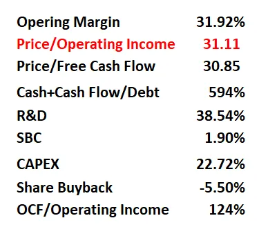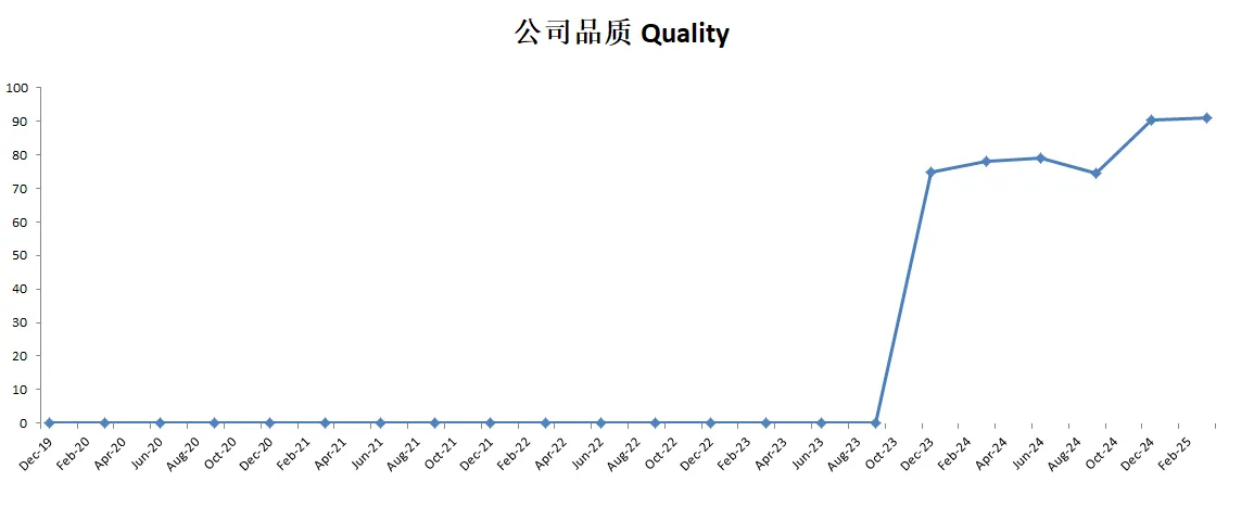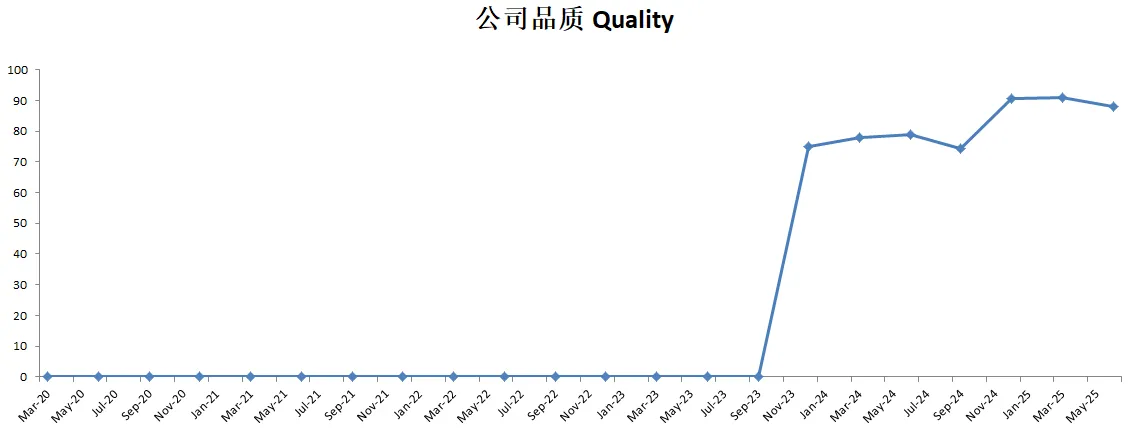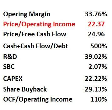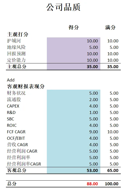 -最新财报之后,公司品质分为88,分数仍然非常高。在我的观察单中,仍然可以排到第三。公司R&D开支非常大,这个季度公司也是加大了科研投入。所以这个项目上得分很低。其他项目上公司表现可以用优异来形容。另外值得注意的是,这个季度,公司股份回购力度翻了2倍。