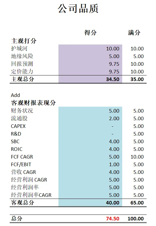 -主观分我还是给了满分15分。我仍然认为ASML目前来看,拥有全世界第一的护城河。客观分得分ASML也是非常高。不过比起上个季度,稍微掉了2分。总的来说,除开R&D开支很大以外,其他指标表现非常优秀。