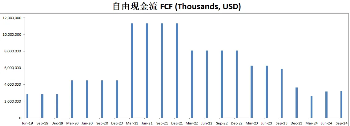 FCF最新有2.65B,不过相较上个季度明显下滑,5年来CAGR有差不都20%多