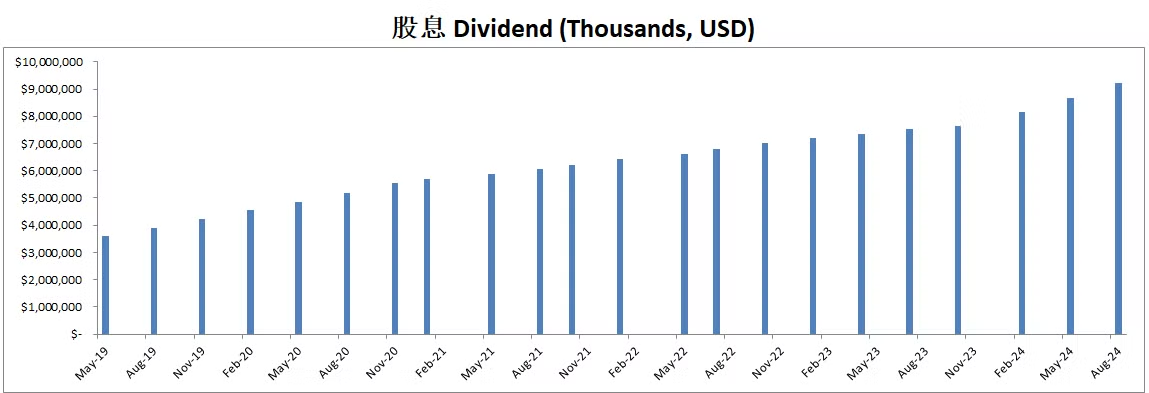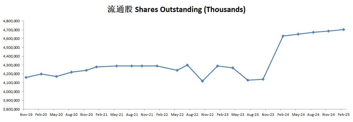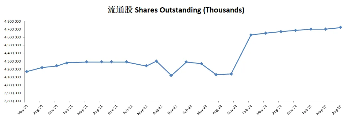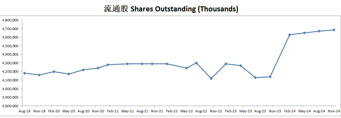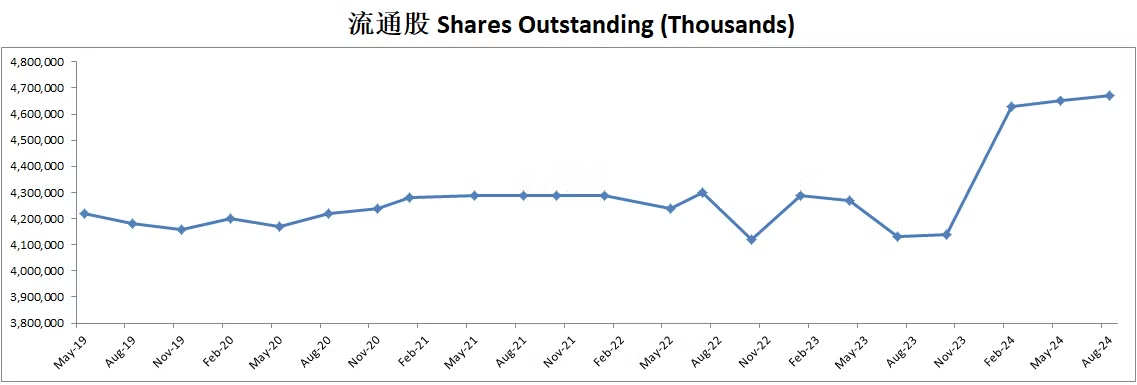 公司不但派息,而且还坚持回购股份,不过即便如此,近5个季度来,流通股有一定的增发,稀释了股东权益