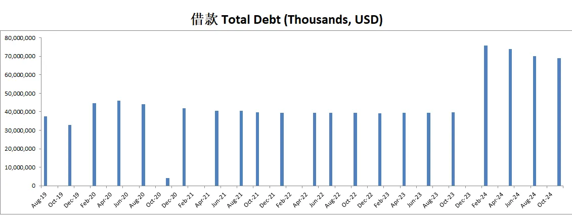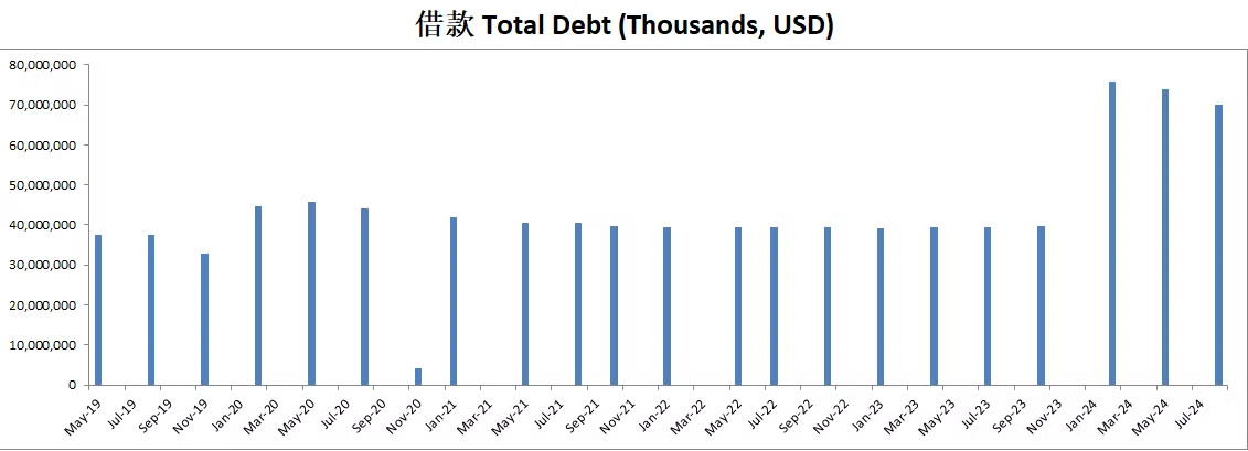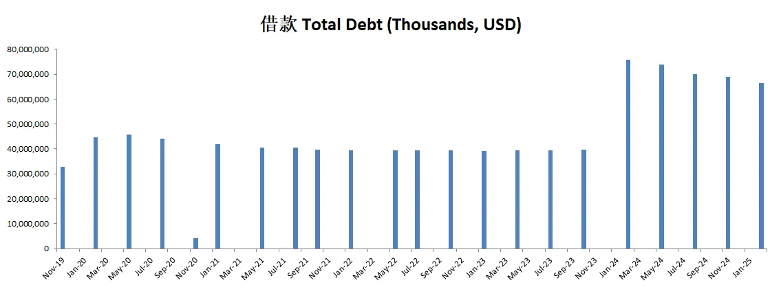 博通于2024年Q1季度以 69B 收购VMware,交易在2024年初获得多个国家监管批准。此收购大幅增加了博通的资产和负债,尤其是在2024年第一季度财报中表现显著。公司通过发行约30B的借款,导致总借款从39.65B增加到75.90B。