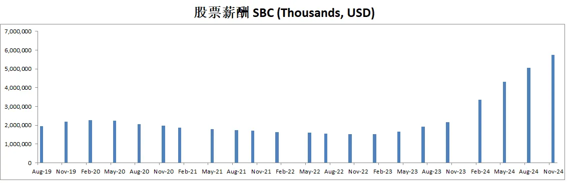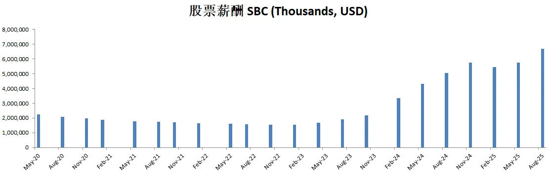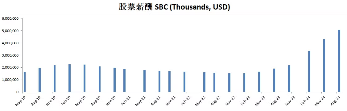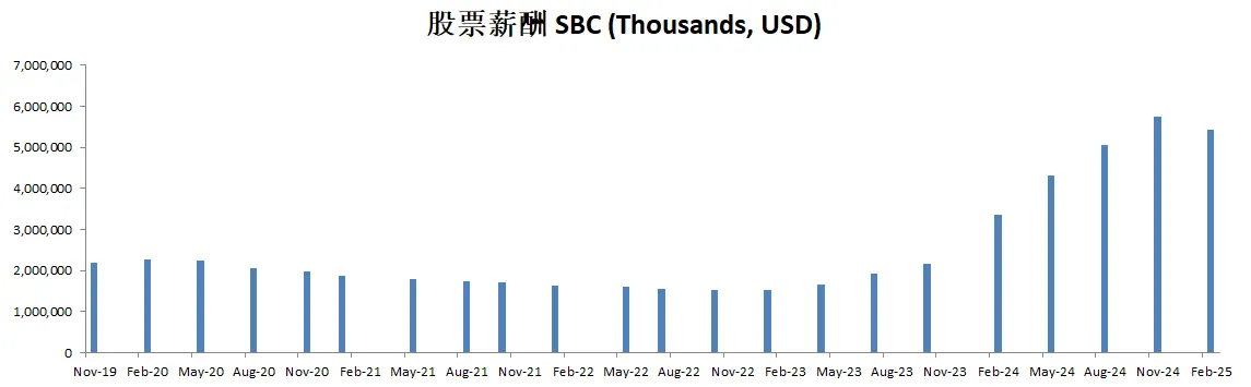 股票薪酬也是水涨船高,目前来到了3.36B,占自由现金流比重也是越来越高