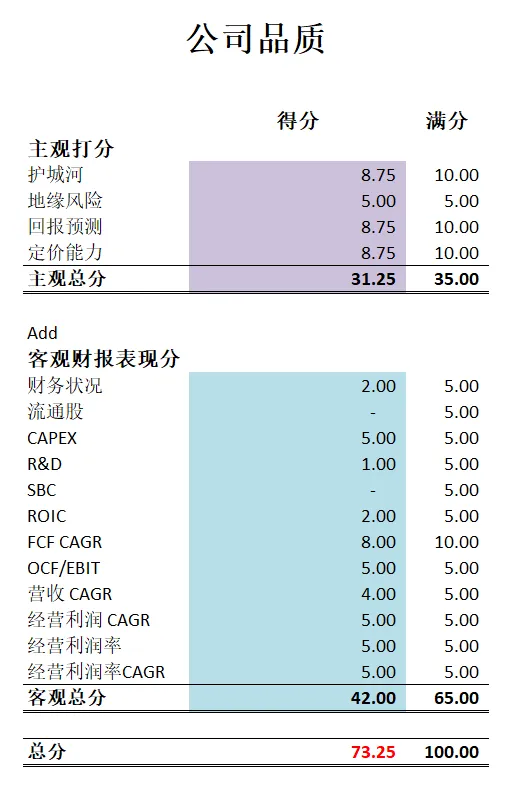 -最新公司品质分为73.20分。主观分我给得很高。护城河我给的也算是全球第一梯队打分。公司流通股,R&D,SBC,ROIC得分都不高。不过其他项目表现很出色。