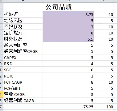 -公司品质还算不错了,有76.25分,扣分项目也是因为激进的并购导致的,似乎有点低估了它的实力。