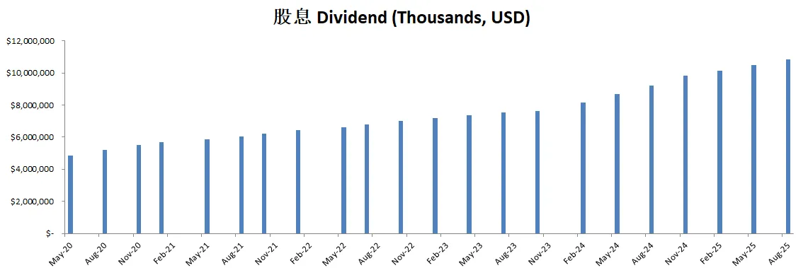 四、资产负债表与现金流 公司第一季度自由现金流约为 60 亿美元,占营收比重为 40%,虽然受到美国税制变化与较高债务利息的影响,但依然保持了健康的现金流表现。本季度资本支出仅为 1 亿美元,相对营收规模处于较低水平,凸显了公司在资本投入方面一贯的谨慎管理。债务方面,Broadcom 通过再融资及偿还浮动利率债务净计减少约 11 亿美元,目前固定利率债券加权平均票息约为 3.8%,平均到期期限为 7.3 年,浮动利率部分的票息约为 5.4%。在向股东回报方面,公司在第一季度支付了 28 亿美元现金股息,每股季度股息为 0.59 美元,同时因员工股票解禁所需的预扣税费而回购了约 20 亿美元的股份。