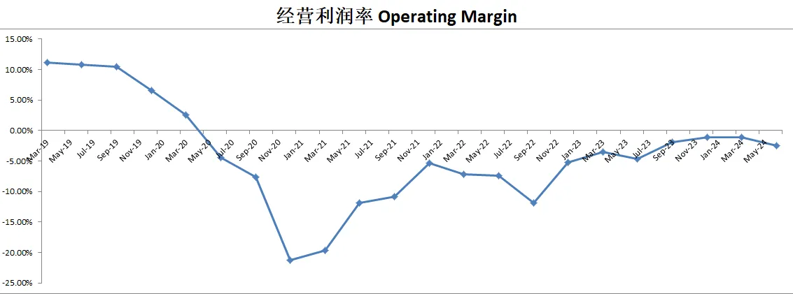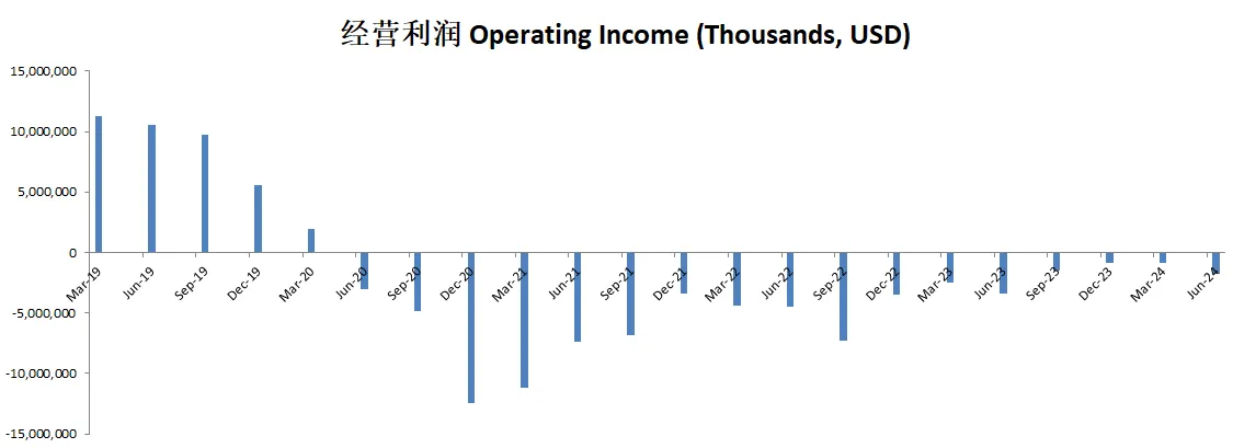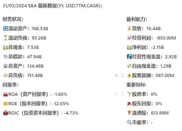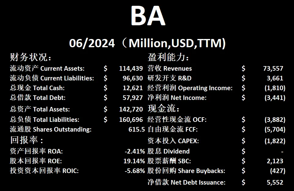查看损益表中历史数据,波音自从20年Q2季度开始,就再也没有盈利过,要知道之前,波音一年TTM经营利润基本上在10B左右