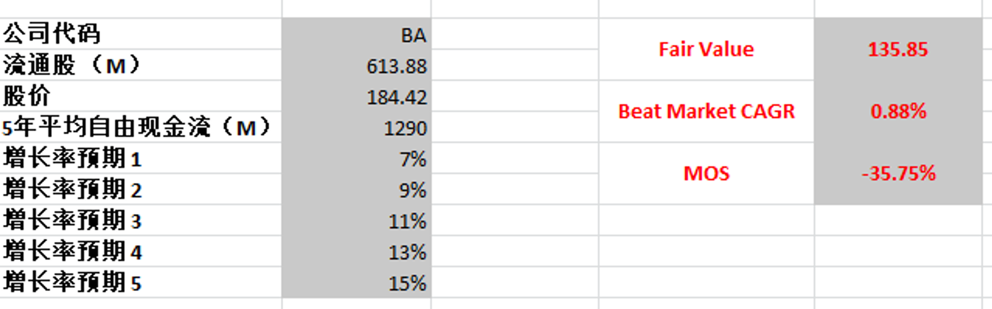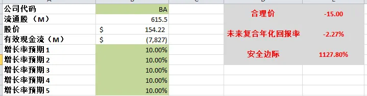波音估值完全是看它是否能扭转败局,不过目前来看,即便我最高给15%的CAGR,使用最新FCF,合理价也就135.85,目前波音的股价并不便宜