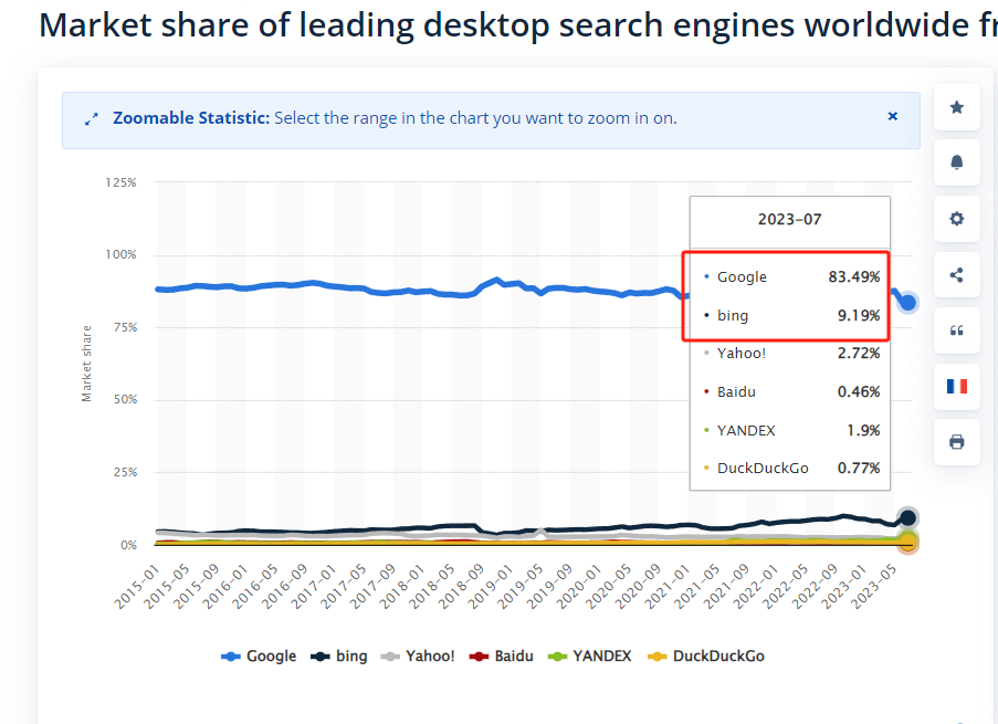 再来我们来谈谈搜索引擎,从这张图上来看,已经很明显了,Google占比83.49%,其次就是微软Bing 9.19%,毫无疑问,google在搜索引擎上的垄断地位无法被撼动,微软Bing目前联合ChatGPT实现AI智能搜索引擎是否能够在未来把google踢下神坛?我们也只能说是走一步看一步,微软在搜索引擎市场未来的表现,目前来看,只能说是未来可期