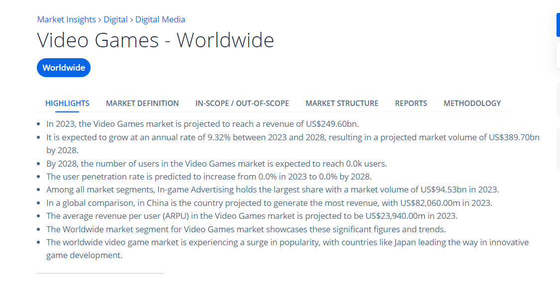 我们再来看看这张图,目前全球游戏市场大概营收在249.6B,预期在2028年这个数字会来到389.7B,CAGR是9.32%,游戏市场也可以说是一个高速发展的市场,前景非常nice,微软目前的布局,以及短期内未来的规划,我还是非常认可的,在这个领域微软可以说是占据了游戏的众多制高点,护城河自然是非常牢固