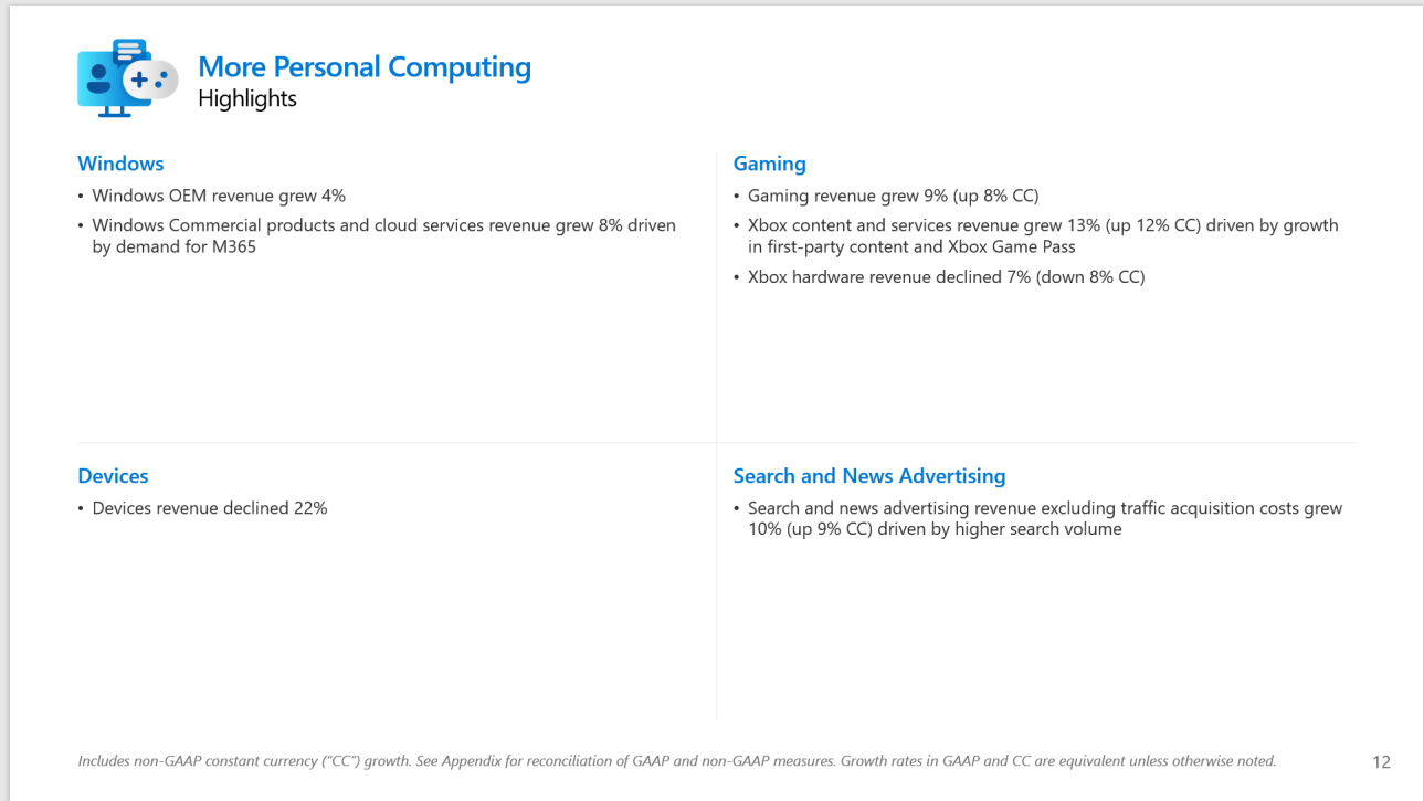 🎮 游戏的世界里,微软不仅仅提供平台,更是内容的创造者。Xbox内容和服务的收入增长了13%,这是对Xbox游戏通行证以及一系列第一方内容不断增长认可的体现。
