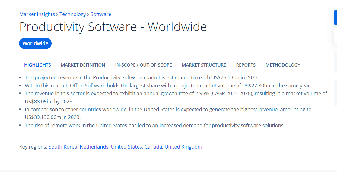 再来,我们来看看statista上软件市场全球数据,目前2023年全球productivity software市场营收大约76.13B,预计2028年,这个数字将会来到88.05B,CAGR是2.95%,可以看出这个市场发展相较于云端市场较为缓慢。