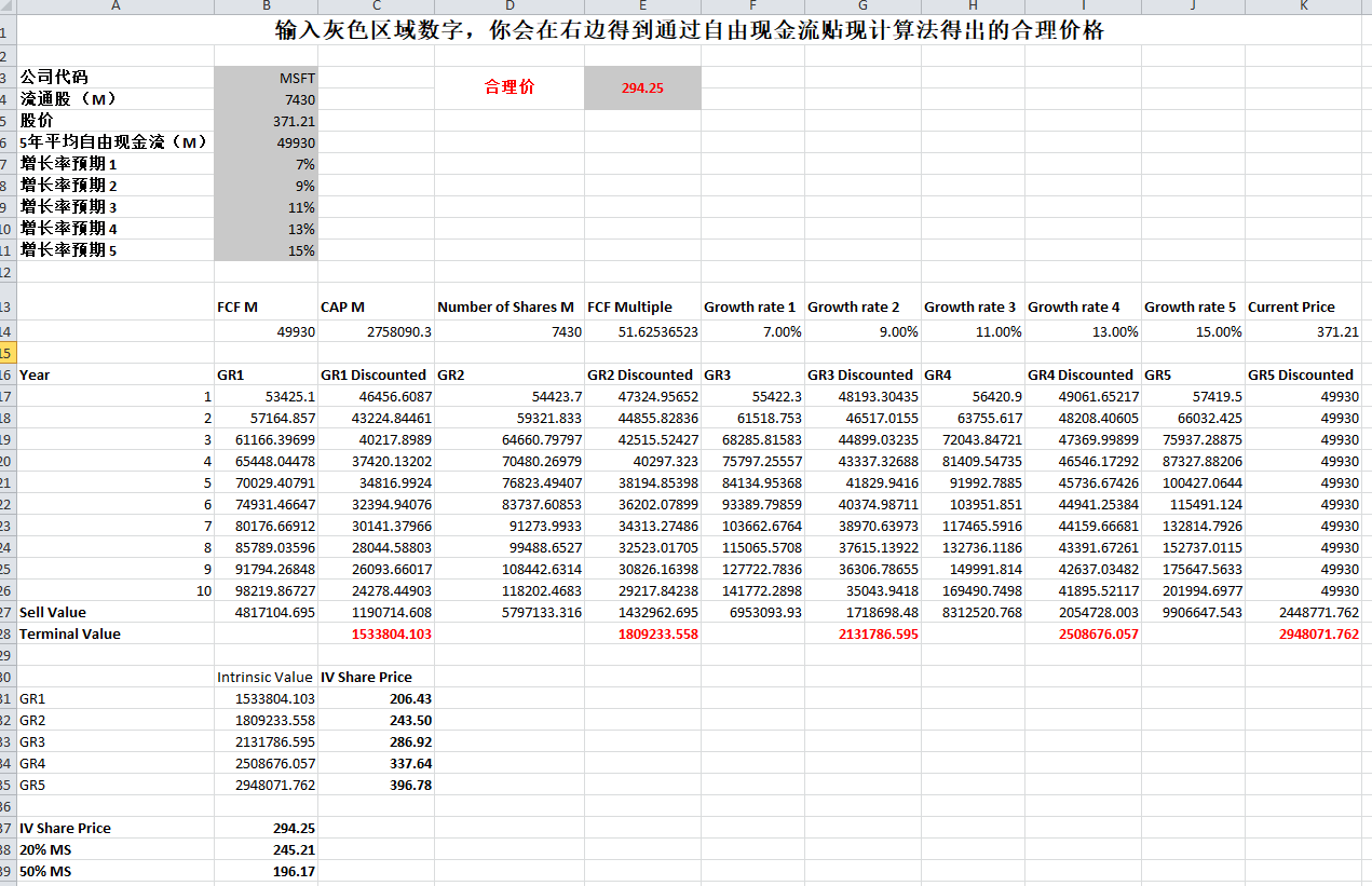 我们现在使用我的合理价计算器来给微软估值,目前微软流通股大概是7.43B,也就是7430M,股价最新已经来到了371.21,5年平均自由现金流是49.93B,也就是49930M,5年自由现金流CAGR是13.68%,那么这边我自己最高这档预期使用15%,以此类推最低这档使用7%,输入完数据,这边立马就给出了目前通过我个人的计算,微软的合理价是294.25,我们往下看,如果是15%这档,合理价应该是396.78,如果是7%这档,合理价是206.43