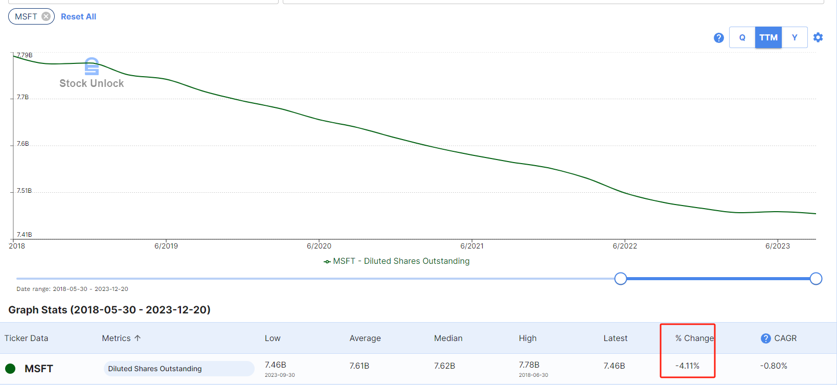 我们来看看微软的流通股,我们发现5年来差不多微软已经买回去了4.11%的股份,平均一年买回去0.8%,这个数值,基于微软的体量,还是很可观的,这说明微软管理层还是很看重股东的利益,在不断发展的同时,也在以股息和股份回购的方式增加股东利益。