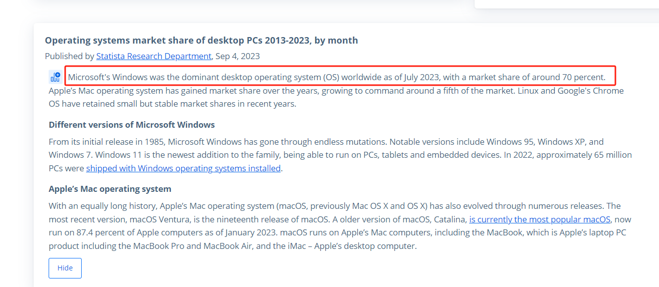个人电脑这块,我们看到截至2023年7月,微软windows仍然占有70%的市场份额。我自己就是从windows95还是使用,一直用到现在,掐指算一下,已经差不多快30年了。Windows的护城河可以说是根深蒂固,也是毫不夸张。