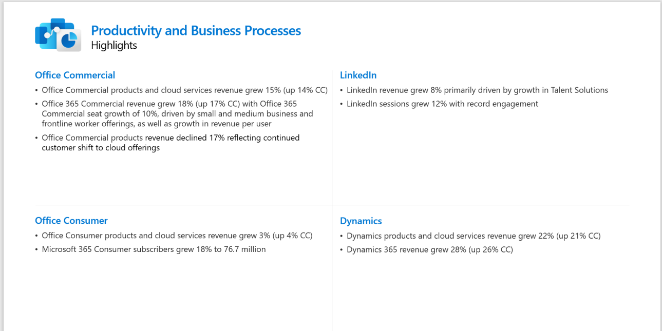 消费者版Office产品和服务也有所增长,微软365消费者订阅用户增长至76.7M。