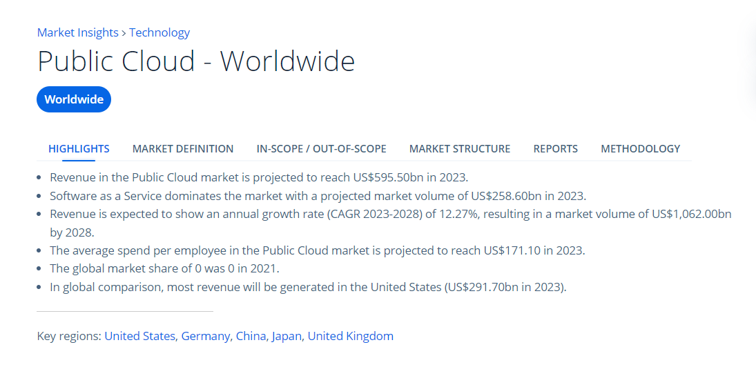目前2023年全球云业务总营收大概595.5B,预计2028年这个数字会来到1062B,CAGR复合年化率是12.27%,可以看出云端市场总的来说是飞速发展的阶段。