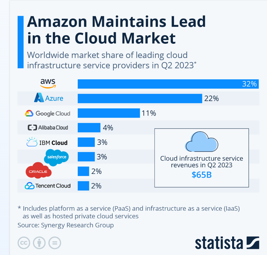 我们看到statista上截止23年8月的数据,目前来看,亚马逊旗下AWS是最大的大概市场份额占比32%,紧随其后就是微软旗下Azure22%,虽然比AWS少了10个百分点,但是比第三名google云市场份额要大一倍多,AWS和Azure加在一起目前已经占比超过整体市场一半了。而我们前面财报中得知,目前Azure是微软旗下最大的部门,所以从云端市场来分析,微软还是相当有竞争力的,也是位数不多的可以叫板亚马逊AWS的企业。