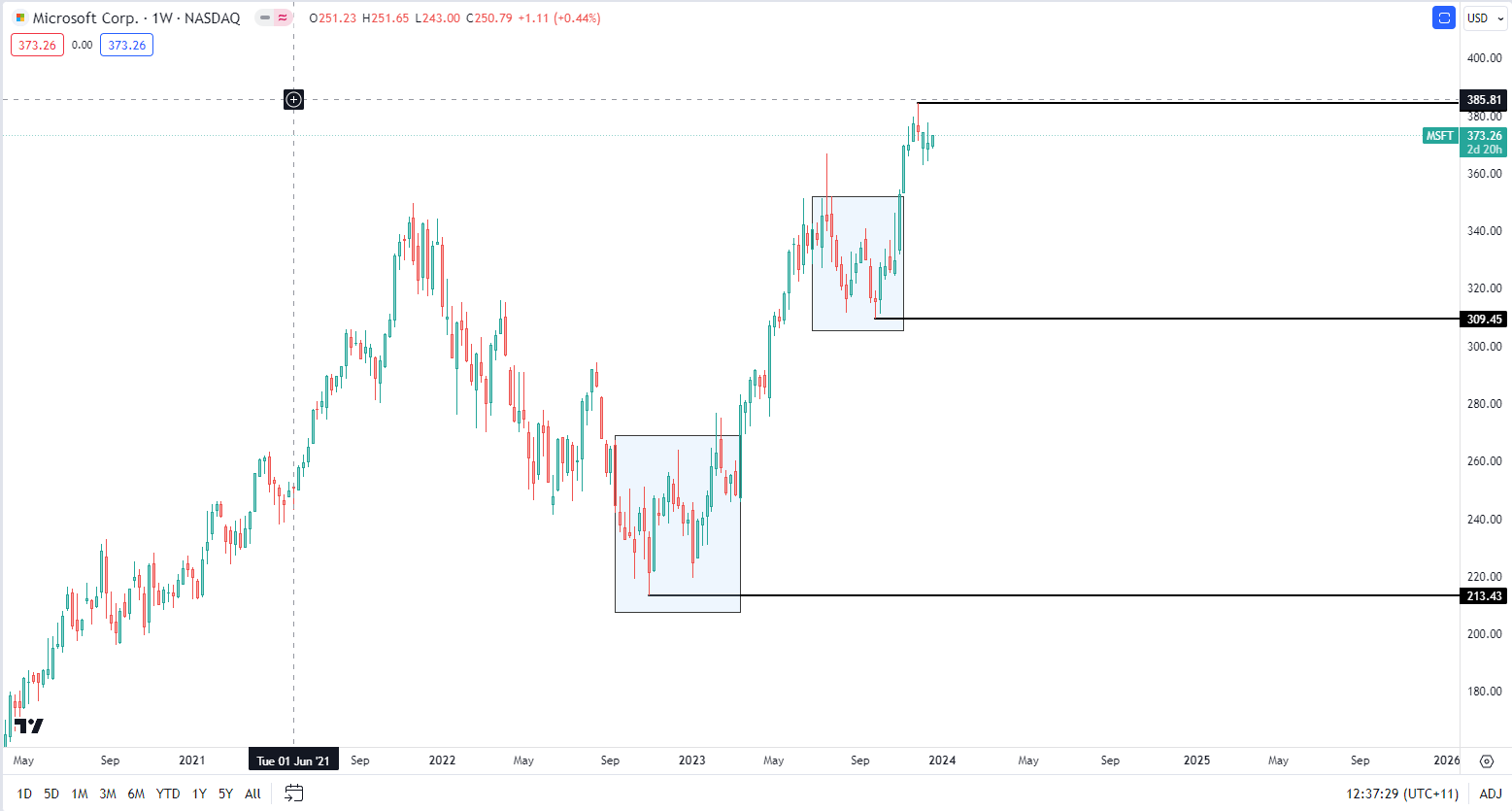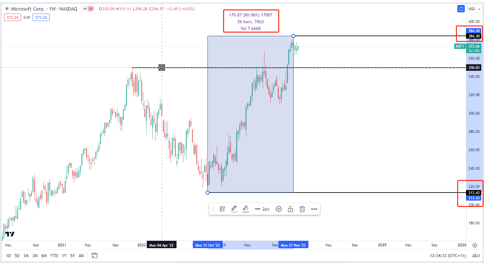 然而从22年10月触底之后,历时近400天,微软的股价从213.43涨到了前面峰值384.3,涨幅达到80%