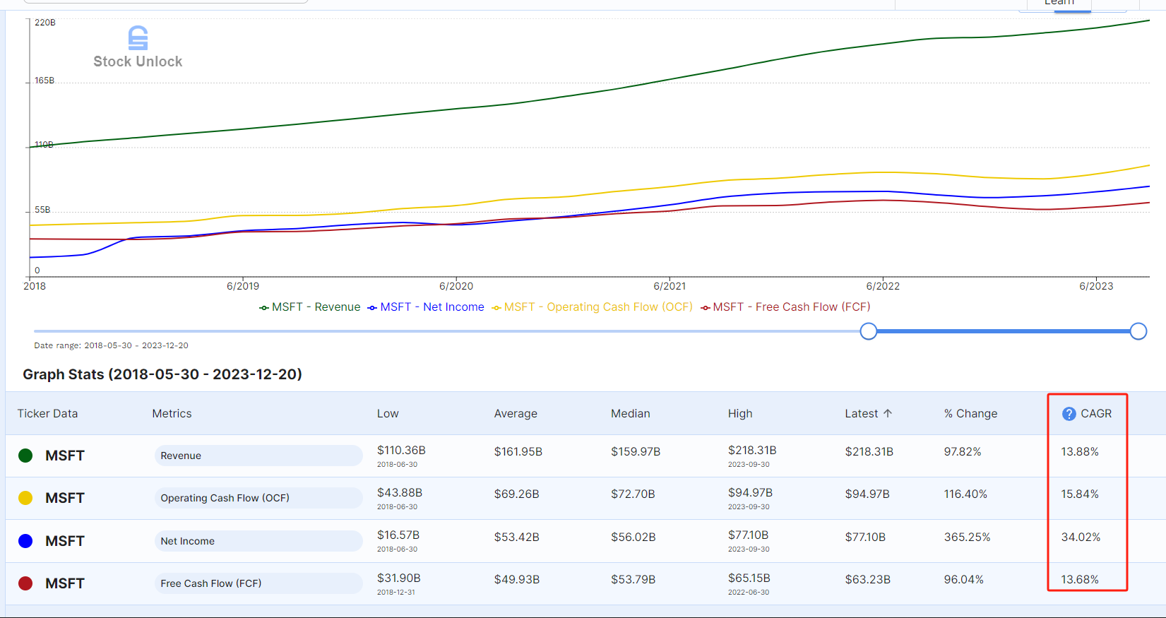 💼 自由现金流,作为企业健康的核心指标,同样展现出了稳健的增长,CAGR达到了13.68%。这不仅意味着微软有着充足的现金来支持运营、投资和回报股东,更是其长期财务策略成效的明证。