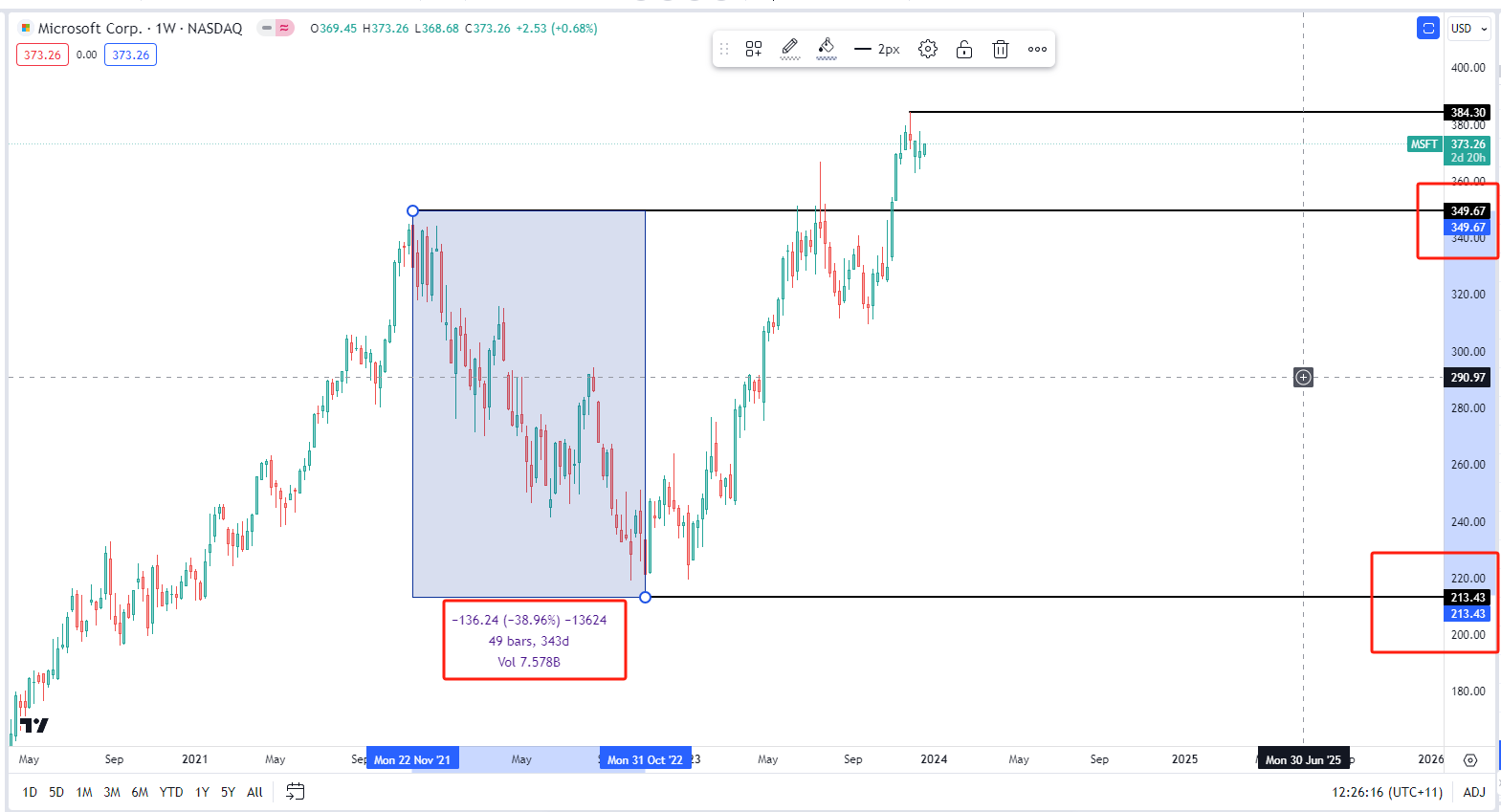 我们来看下微软的周线图,自从21年11月微软来到前高349.67之后,历时340多天一度在22年10月底来到了213.43价位,跌幅有38.96%