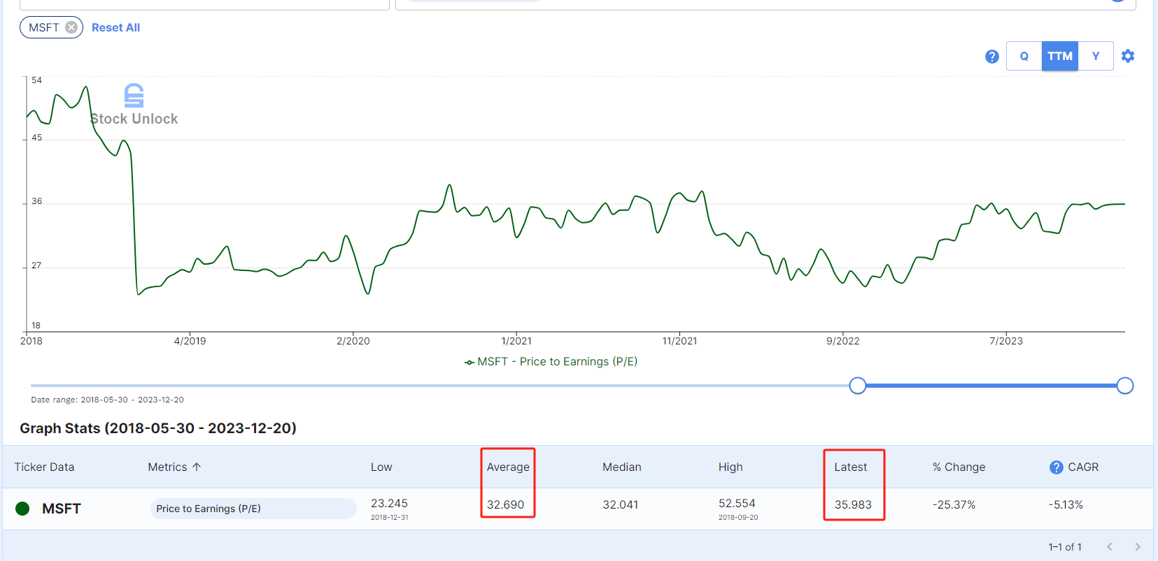 我们看下微软的市盈率,5年均值是32.69,目前最新PE是35.98,比均值稍微高一点,从市盈率的角度来看,目前微软股价估值略高