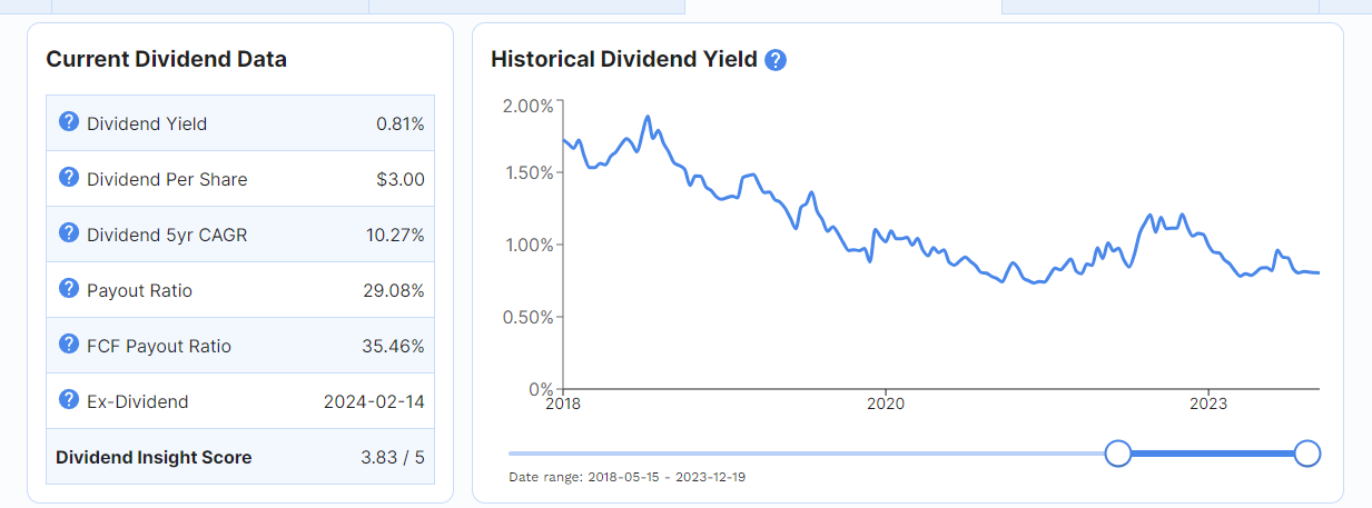 微软是发股息的,目前来看股息率是0.81%,每股发$3股息,5年来股息CAGR复合年化增长率是10.27%,payout ratio很健康29.08%,自由现金流payoutratio是35.46%,下一次股息发放日是2024年2月14号,情人节那天。总的来看微软的股息很稳定,并且它也并没有大力发股息,股息率虽然不高,但是5年来一直在增加股息的发放。