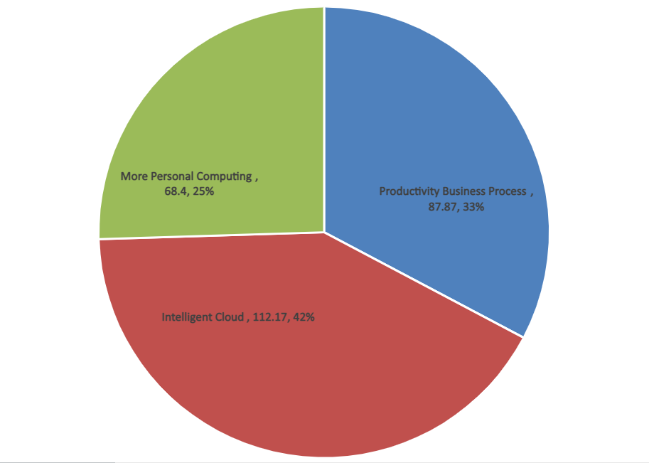 我们把财报中显示的5个季度数据都加起来,就得到了这张pie chart,生产力和商业业务大概占比33%,营收87.87B,个人化计算机业务占比25%,营收68.4B,云业务占比42%,营收112.17B