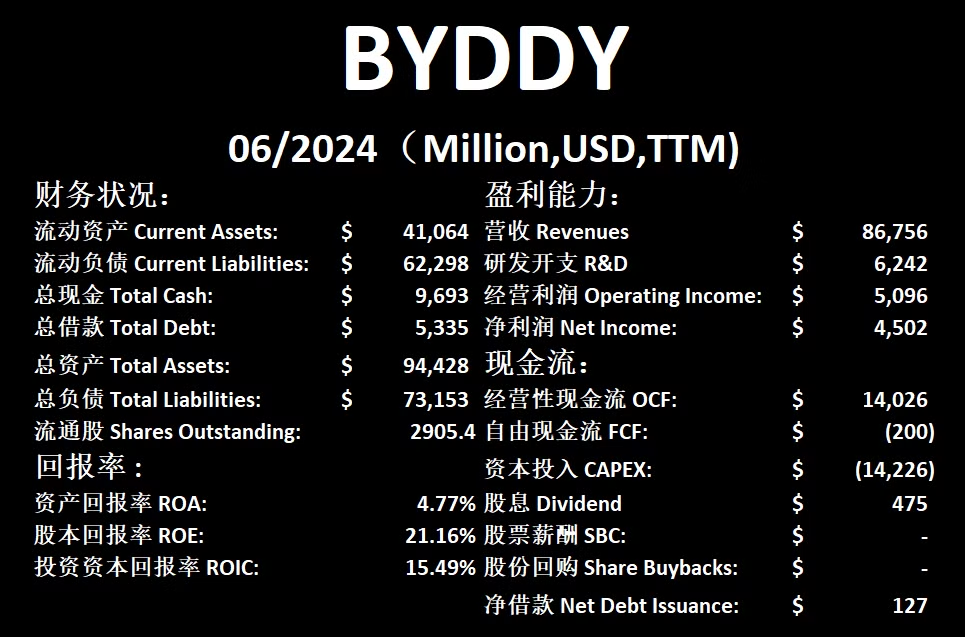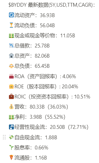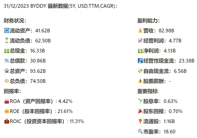 比亚迪(BYD)最新面板:短期财务堪忧,不过长期来看仍然健康,手上还有$11.05B现金,回报率增长迅速,股本回报率有20.04%,营收增长迅速,CAGR 36.03%,经营性现金流飞速增长(72.71%),说明公司销量突飞猛进,比亚迪的CAPEX非常大,公司正在大量烧钱,扩大规模