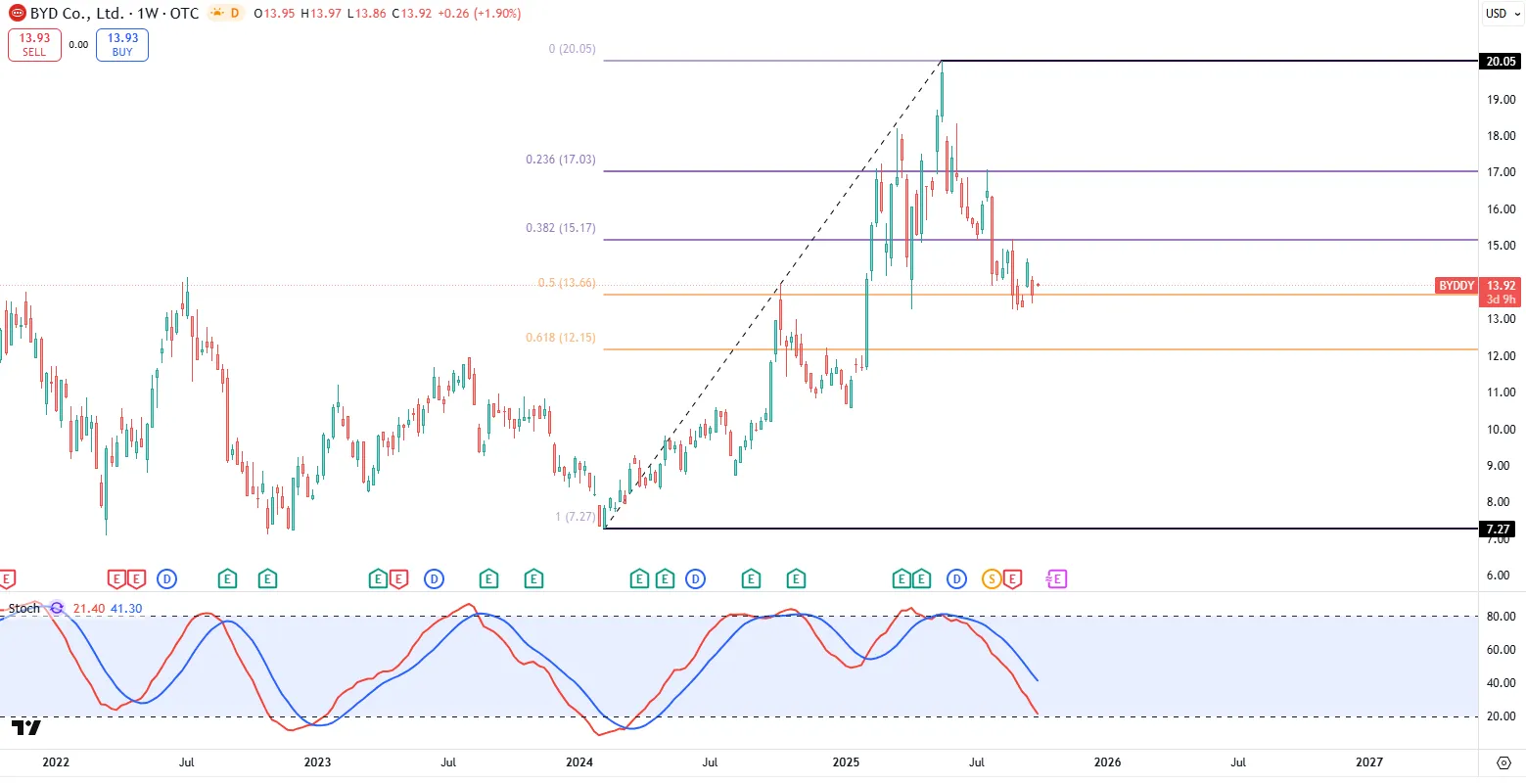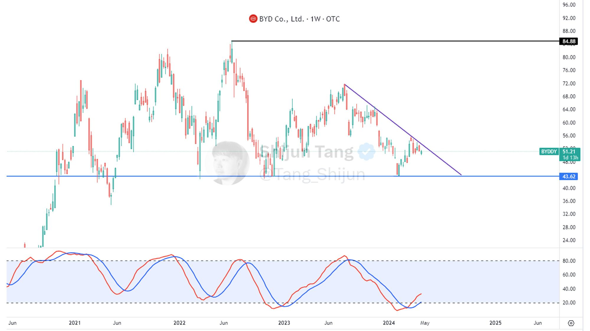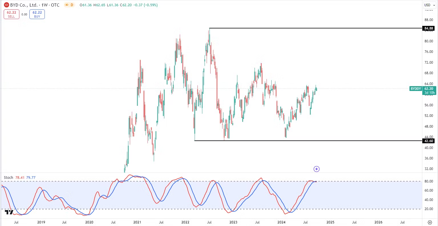 比亚迪( $BYDDY )自从22年7月站上84.88的历史新高之后,已经一度跌了48.61%